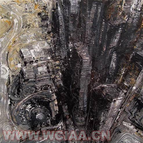 “对艺术有着火一样狂热和朝拜式虔诚的——许章伟”一直试图远离喧嚣嘈杂的都市,去寻觅一个清静的地方,在这幅《大时代风暴系列》的作品中,清静是一片废墟,一个被遗忘的过去,在一座繁华的建筑群下,让人看到,听到从水泥钢筋构架中传来的冷笑,他本来可以去探寻地方的历史,发出心底的感慨。不知是安然于孤独的存在,还是徒劳地寻找往事的记忆,在他的这幅作品中,用近乎全灰单色的模糊画出整个画面中间的空白,那种灰暗阴沉的颜色,就是废墟内部的空间,它不像真实的存在,而是一个符号、在空白的中间,偶有一块明亮、像是现实的光线照进历史,使得灰暗显得更加悠远,将历史的废墟变成心灵的叙事,表达出作者心里总想排斥的东西,以现实的符号喻示内心的冲突,强烈地表现出从都市的喧嚣中逃避出来,寻找精神与记忆的柄息之地,他把艺术的追求隐藏在生命的经验和生存状态之中,用一种心理抽象使他的创作形式具有非常感人的因素,我们可能无法很具象描述他到底画了些什么,我想无论是语言或文字的诠释都会显得很苍白,但我们会被他感动,他的状态也是我们共同的状态,但他用艺术语言表述出来了,让我们感同身受。