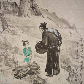 “思凡”这幅作品整个画面上下左右留出大块空间,给人以疏朗之感,小和尚背负思凡仙女一脸欣喜若狂之态。小和尚行不过三步一回头双目相视,对成连线,虽背负仙女,但紧松有致,仙女及小和尚面部勾勒用墨简洁,神彩动人,衣纹以淡墨勾线,在仙女袖边飘带处稍加烘染,就把二者间形体神态融为合一,画面全凭线条粗细、虚实、浓淡以及轻重起伏的变化相互衬托和对比使整幅画面丰富多彩,看画面虽是背负思凡女子,但行走时步履轻盈,二人重心垂直一线,和谐统一,这是一幅很值得美学研究的精品。